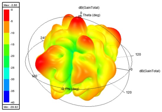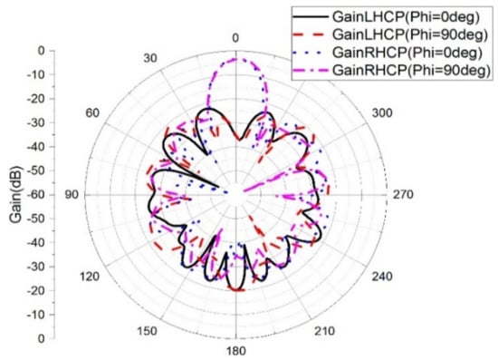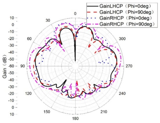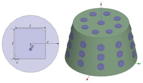 Circularly polarized antenna is conducive to the reception of space electromagnetic wave, so it is widely used in various communication systems [17,18,19,20]. To test the ability of our algorithm to optimize complex problems, a conformal truncated conical array with 39 right-hand circular polarization (RHCP) antennas is built. A single-port circular polarization element is used to reduce half of the unknowns. The structure of the antenna and the array is shown in Figure 6. The RHCP antenna is the same as reference [21]. The upper radius of the cone is 280 mm and the lower radius is 360 mm. The height of the cone is 400 mm. The central operating frequency is 1.575 GHz. The embedded patterns obtained by a high-frequency structure simulator (HFSS) are used in the algorithm to improve the accuracy of the synthesis. In this example, HDE-WTLSM is used to obtain low SLL synthesis and cross-polarization suppression simultaneously.