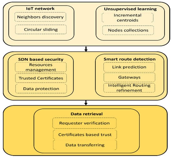 Figure 2 illustrates the working flowchart of the proposed model. Its main components are data collection from IoT networks and repeat-generated centroids using neighbors until IoT nodes are organized into collections. Next, near-optimal routes are predicted from the IoT network layer to SDN switches without predefined assumptions. The SDN component in the proposed model manages the network resources and offers a balancing load for the IoT network. The SDN gateways are collaborated with the centralized controller to deploy the security against malicious and unauthentic nodes. It supervises the network operations using trusted certificates and initiates the routing phase in a systematic approach. Upon receiving the request from application users to facilitate its request, the proposed model first verifies its authentication and, in case of authorized status, the cloud servers offer the needed service. However, if the requestee node is found to be malicious, its identity is marked as faulty, and received requests are not accepted. Additionally, signed keys are generated among cloud servers and application users to producing encrypted blocks and attains privacy with authentication. Algorithm 1 illustrates the pseudocode of the proposed model.