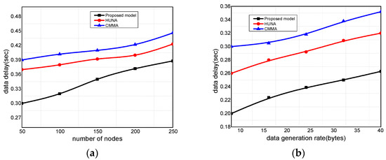 Performance of data delay with varying number of nodes (a) and packet generation rate (b).