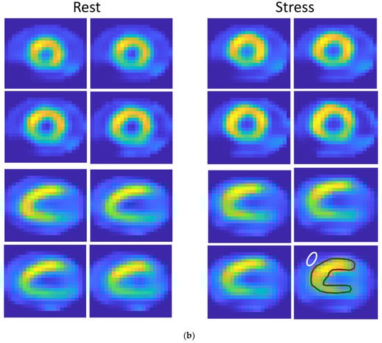 Images from a patient, in rest and stress conditions; the first two rows are relevant to cardiac short axis views; the last two rows are long axis views. (a) Images acquired by Alcyone (b); images acquired by Discovery. In the lower right image in b, the ROIs covering myocardium (in red) and background (in white) are shown as an example to show where ROIs have been selected for numerical analysis (i.e., uniformity, SBNR, and TCBNR).