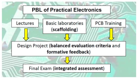 Hence, some institutions provide specific project-based learning (PBL) course to address these deficiencies. Each one has different style of implementations [13,14]. At Griffith University, this course is called “Practical Electronics”, and the author has been in charge of it since 2011. In the early years, students were frustrated with unclear expectation for the design project and often felt overloaded and stressed. It should be noted such problems have been well-reported in many PBL courses [15,16]. In response to these complaints, there have been many evolutions in the course structure and delivery, which eventually resulted in improved learning outcomes and students’ satisfaction. The objective of this perspective is to share four strategies that have been implemented in Practical Electronics course, namely scaffolding, balanced evaluation criteria for assessment, providing formative feedback, and designing integrated assessment items. As a result of these strategies, students’ learning outcomes improves in the last five cohorts. The average marks for 2016, 2017, 2018, 2019, and 2021 cohorts are 64.75%, 63.73%, 62.76%, 72.95%, and 70.86%, respectively. In addition, the percentage of students who received the top grade of high distinction for the same cohorts are 0%, 13.3%, 10.7%, 12.5%, and 29.6%. The data for 2020 are not used, because the author was on sabbatical and was not teaching that cohort. Moreover, the laboratory-based activities for that year were shifted to simulation-based projects due to the campus lockdown during the pandemic.