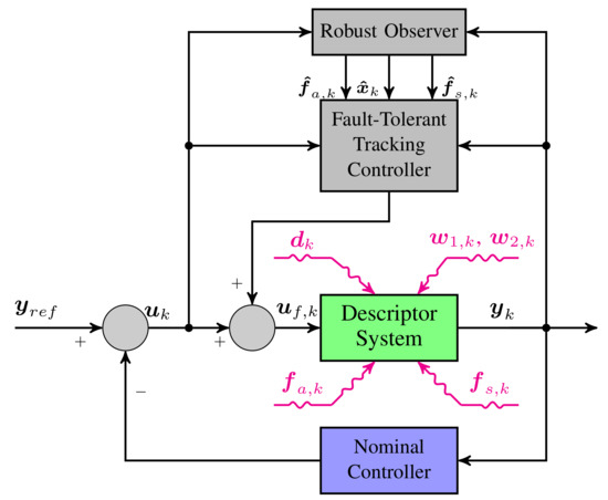 Indeed, since it is a common knowledge that the system may be split into actuators and process dynamics, as well as sensors, they all might be affected by faults. Of course, the system here is transformed into a descriptor one; however, this is due to the fact of an estimator structure capable for reconstructing both state, as well as sensor and actuator, faults. In this case, the system is affected by the actuator faults and sensor faults , as well. Moreover, unknown input disturbance also affects the system. Besides process and measurement uncertainties, and influence the system, as well. So, to handle such inflows, it is proposed to employ an additional fault-tolerant tracking controller, along with a robust observer, which, together, modify the control input irrespective to the nominal controller already worked within a closed-loop, to ensure a stability of the system in case of the occurring faults and the external disturbance. Let us start from defining the reference controller without any faults and disturbances, which is already implemented in the system: