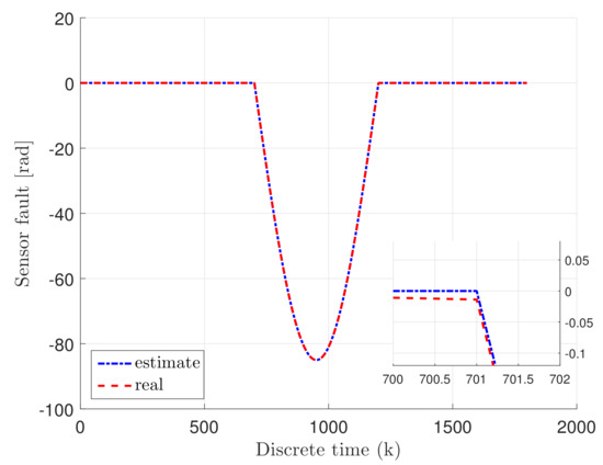 which means that the sensor fault occurred in the first state , while the unknown input disturbance occupied the third state I. Note that the sensor fault is designed based on sine wave, where amplitude is , along with period equal to 500. Moreover, the actuator fault is exponentially increasing slowly over the time, where indicates the completely failure. Based on this fault scenario, it is easily seen that the actuator and sensor fault, as well as the unknown input disturbance, occupied the system, simultaneously.