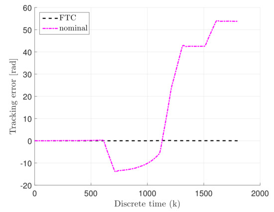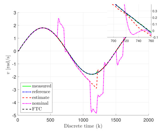 Thus, Figure 6, Figure 7 and Figure 8 show the response of the system for the states , v, and I, which indicate the rotation angle, rotary speed, and current value of the DC servo-motor, respectively. It can be easily seen that estimation is following the nominal control state as long as the unknown input occurred in the system. In the other hand, the nominal controller is following the reference state until the actuator fault and unknown input occurred. Nevertheless, the FTC state is following the reference state, even the faults, as well as unknown input and external disturbances occupying the system, simultaneously. Therefore, Figure 9 and Figure 10 illustrate the control and tracking error comparison between nominal and fault-tolerant controller. Accordingly, from Figure 9, it can be observed that FTC control input is changed due to the fact that the actuator fault and unknown input disturbance occupied the system, while the control input of nominal control is unchanged. Consequently, the tracking error of the FTC is oscillating 0, while the tracking error of the nominal controller is increasing due to the occurred actuator fault and unknown input disturbance.