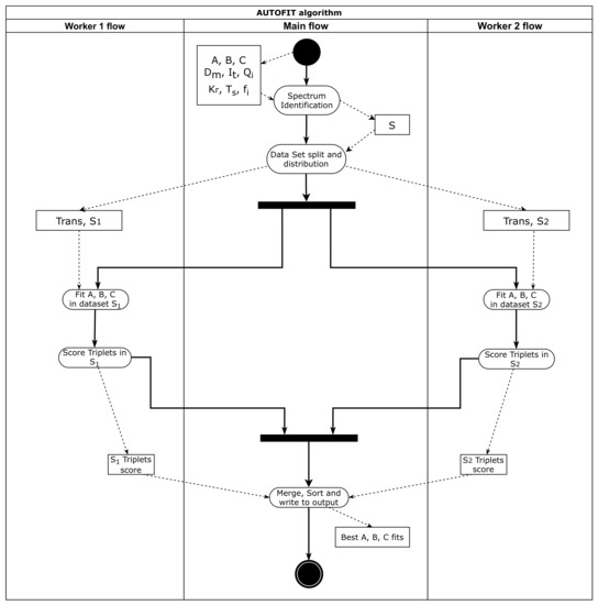 From a computing perspective, the triplet fitting step is an embarrassingly parallelizable job. The entire spectrum data to explore can be split into multiple data chunks (), each of which is then assigned to an independent search task, which does not need to communicate with its peers to carry out its own work. This kind of parallelism is known in the literature as data parallelism [19]. Eventually, AUTOFIT collects results from all task computation and merges them in the final output. By virtue of the described approach, AUTOFIT can exploit the CPU cores of a computing machine (even an off-the-shelf PC) in order to shorten the overall computation time. To give an explanatory example, on an N-core CPU we could split the spectrum data into N equally-sized data chunks, and feed them to as many search tasks that will execute in the form of computing threads (each served by one CPU core). Unfortunately, increasing the number of data chunks (and consequentially, of threads) beyond the number of CPUs, available cores will not produce a performance gain, as the exceeding number of threads would still have to wait for free cores to execute. For this reason, AUTOFIT cannot accommodate highly demanding jobs. If the theoretical results are not as accurate as requested, the frequency range in which to look up fitting triplets needs to be widened. A wider spectrum will produce a much larger dataset (S, in Figure 1) which, given the limited number of available cores, can cause an unacceptable increase in the AUTOFIT execution time, thus making the tool useless.