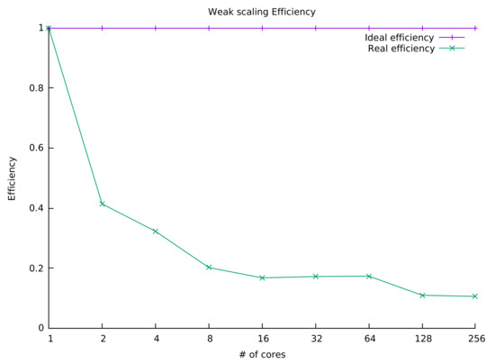 The weak scaling index provides a measure of the speedup performance that the application can gain from leveraging the power of an increasing count of processing cores, provided that the overall workload increases so that every added core gets the same, fixed-size workload. For this experiment, we considered a reference working unit of 8000 triplets. We ran nine tests to assess the speedup trend on 1, 2, 4, 8, 16, 32, 64, 128, and 256 processing cores, taking care that each core was assigned a workload size that equaled that of the reference working unit (8000 triplets). In practice, at each step we doubled both the core count and the overall workload. The overall assignment of cores/triplets for the nine tests is depicted in Table 2.