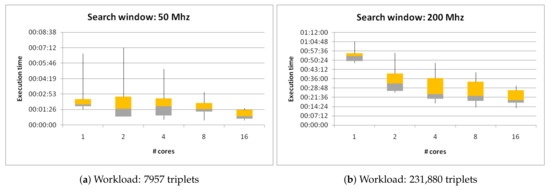 In the tests, we considered the following workloads: 7957 triplets, 39,556 triplets, and 231,880 triplets. For each workload, we ran HS-AUTOFIT instances with increasing numbers of cores in the range [1–16]. In Figure 5a,b, we report the results of the tests in the form of box-and-whisker charts for the workloads of 7957 triplets and 231,880 triplets, respectively. The chart depicting the results for the 39,556 triplet configuration was omitted for space reasons. The reader will notice that the higher the workload, the lower the uncertainty of obtained results. Furthermore, for both workload configurations, the result uncertainty decreases as the core counts increase. We can conclude that, in the case of consistent workloads and a relatively high number of cores, the results have robust statistical significance.