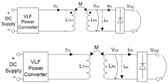 A typical system design of a WPT system is shown in Figure 1. The VLF block converts DC power to a VLF signal, with typical frequencies of tens of kHz. and are the Tx and Rx coils’ inductance, respectively. M is the mutual inductance between and , is current through when the terminals are shorted, and is the voltage when the coils’ terminals are left open. is a DC voltage proportional to the received power and load impedance.