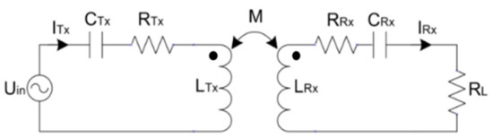 where is the coupling factor, and is the output voltage of the Tx. Equation (2) shows that the output power can be increased if either the coupling factor or the loaded quality factor increases, for a given input power. If the frequency is increased, a higher can be obtained [16]; however, copper and switching losses also increase. The configuration is presented in Figure 2, where and represent the resistive losses of the Tx and Rx coils respectively, and and represent the Tx and Rx capacitors, respectively. A drawback of the series–series configuration is that maximum power transfers can only be obtained at off-resonant frequencies, thus there will always be a trade-off between maximum power output and efficiency.