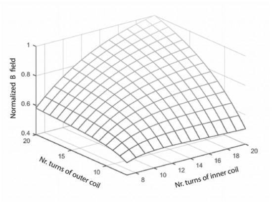 Magnetic flux density, for a constant voltage input, at the center of the pad, as a function of (the inner coil number of turns) and (the exterior coil number of turns).
