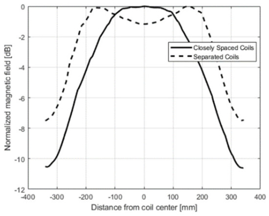 Simulated magnetic field intensity of the Rx charging pad (finite element simulation) at a height of 10 cm. The dotted line represents the field distribution when the coils are designed such that both the inner and exterior coil are close together, and the continuous line represents the field distribution when there is a big difference between the inner diameters of the two coils.