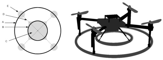 Positioning of the proposed Rx coil on the UAV chassis. “A” represents the outer Rx coil, “B” represents the inner Rx coil, “C” represents the UAV chassis, and “D” represents the “wings” of the UAV to which the motors represented by “E” are attached.