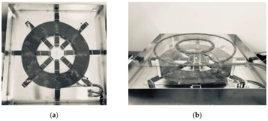Both Tx and Rx coils have been designed with the same type of Litz wire, having a copper diameter of 1.6 mm and a copper + isolation diameter of 4 mm. The turn spacing was made as tight as possible. The 8 ferrite bars used were of type N87, with dimensions of 279 × 30 × 27 . The aluminum bottom shielding used was 70 × 70 , and the walls have a 10 cm height. The thickness of the aluminum shield is 2 mm. The parallel configuration of the two Tx coils is shown in Figure 9a, and the Tx–Rx configuration is shown in Figure 9b. Table 1 presents the Tx and Rx pad specifications.