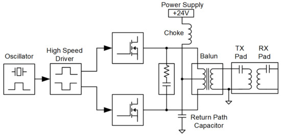 Single-ended Class-E amplifiers have a return current capacitor connected between the Drain and Source of each MOSFET. In the present design, the Drain–Source capacitors are only used to filter ringing effects, together with the Zobel network, while the return path capacitor is placed between the power supply’s choke inductor and ground, right before the balun, as visible in Figure 10. Using the same return capacitor for both the high-side and low-side results in a better balancing, but will slightly decrease the system efficiency due to the additional copper and core losses in the balun. Since magnetic field distribution is a priority in the design of the Tx and Rx coils, the electric impedance matching must be performed by tuning the Zobel network and turning ratio of the balun.
