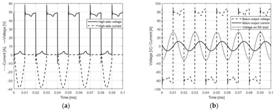 (a) Simulated results of the waveforms in the drain of the MOSFET transistors. The current is represented with a dashed line, and the voltage with a continuous line. (b) Simulated results of the input waveforms from the secondary winding of the balun T1 and the output voltage at the resistive load (RL). The voltage is represented with the dashed line, the current is represented with the continuous line, and the voltage received at the resistive load is represented with the dotted line.