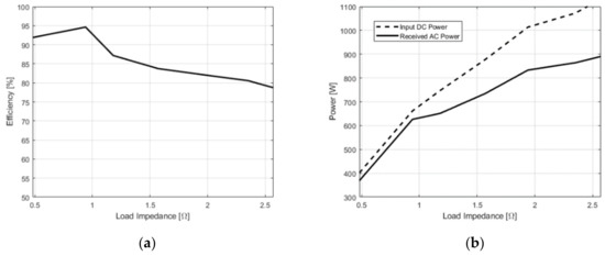 In this section, we first present the influence of the load impedance and positioning on the output power and the efficiency of the prototype. Load impedance changes are mainly caused by two factors: positioning errors of the UAV and the different charging stages of a Li-ion battery [32]. For the present prototype, shown in Figure 12, two series-connected 12 V/18 Ah lead-acid batteries were used to power the system in order to minimize supply broom noise and switching noises in the measurements. In all experiments, the load at the receiver’s end was dissipative and was made out of high-power resistors. Changing the configuration in which the resistors were placed made varying the load impedance very easy and precise. When transferring maximum power, the DC supply voltage dropped to about 22 V. The overall balancing of the power transfer and efficiency can be performed considering three factors: (a) the load impedance, (b) the coupling factor, which is provided by the distance between the Tx and Rx coils, and (c) the turn ratio of the balun transformer.