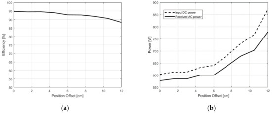 A similar result was achieved for horizontal offset, caused by positioning errors of the UAV. Figure 15a,b graphically present the efficiency and the input/output power respectively, as a function of horizontal positioning offset between the two center points of the Tx pad and the Rx pad. The magnetic coupling between the Tx and Rx coils is presented in Figure 16. All horizontal offset measurements were performed at a constant height of 10 cm. By comparing the results in Table 2 and Figure 16, it can be seen that the coupling is much less sensitive to horizontal offsets than it is to vertical offsets. This is mainly due to the wide and flat horizontal field distribution of the Tx pad. Moreover, when Equation (8) is satisfied, and when the copper and core losses are very small, variations in coupling below a certain threshold have little effect on efficiency.