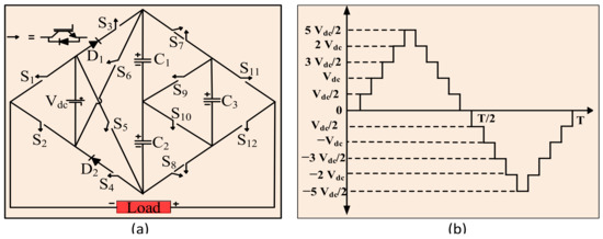 The proposed SCMLI topology is shown in Figure 1a. It comprises 10 unidirectional switches (S1, S2, S3, S4, S5, S6, S9, S10, S11, S12), 2 bidirectional switches (S7, S8), 3 capacitors (C1, C2, C3), 2 diodes (D1, D2), and 1 DC source (Vdc). Figure 1b shows the 11-level output voltage waveform having a voltage boosting of 2.5. Here unidirectional and bidirectional are in terms of voltage. Current can flow in both directions for unidirectional switches also through reverse body diode. The capacitors are connected in the circuit in such a way that they are self-balanced and are charged to the extent that desired output voltage levels are obtained. The capacitors C1 and C2 are charged to Vdc/2, and the capacitor C3 is charged to Vdc to obtain the 11 output voltage levels as 0, ±Vdc/2, ±Vdc, ±3 Vdc/2, ±2 Vdc, and ±5 Vdc/2.