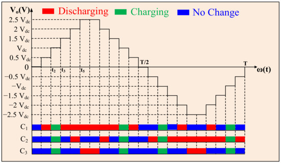 All the three capacitors are self-balanced to their desired voltage levels through the parallel connection of the capacitors to the source and in series with the load at different instants. The capacitors C1, C2, and C3 are being charged during the voltage levels of +Vdc and −Vdc to 0.5 Vdc, 0.5 Vdc, and Vdc, respectively. All the charging and discharging time intervals are shown in Figure 3. Load parameters do not affect the capacitors’ charging interval as the charging circuit of the topology has only diodes, switches, and capacitors [20]. Hence, the charging and discharging intervals for the capacitors are equal in a cycle. Therefore, the self-voltage balance of all the capacitors is maintained irrespective of the loading condition. The largest discharging period (LDP), nominal frequency, least voltage ripple, and maximum fundamental load current are used to calculate the optimum value of the capacitors. Using LDP for capacitor C1, which is the same as that of capacitor C2, i.e., [t3, T/2 − t3], the maximum discharging amount during this time interval is expressed in (1).
