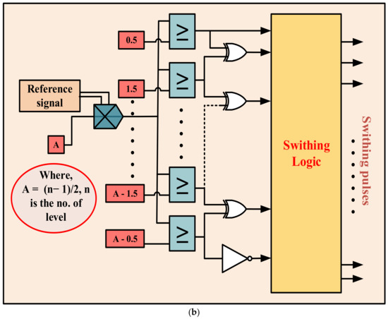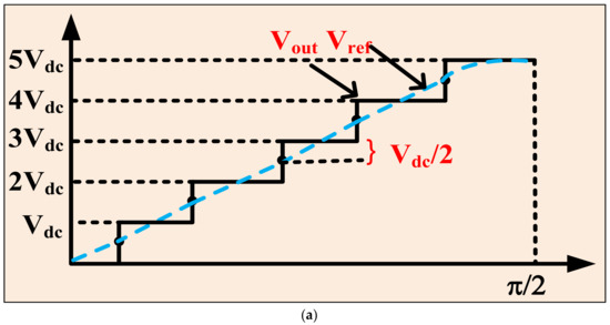 Numerous modulation schemes have been tested and used for multilevel inverters. The nearest level control is a low-switching-frequency PWM technique for which the complexity in implementation is lesser for a higher number of levels [21]. NLC is used here for the proposed topology to control the switches so that the desired output waveform is obtained. In NLC, the reference sinusoidal waveform is compared with the desired output waveform to obtain a sampled waveform. The waveform generated is then rounded off to the nearest level and compared according to the switching logic given in Table 1 to produce switching signals for the corresponding IGBTs. The working principle of the NLC is shown in Figure 4a,b. The symbol “A” in the figure corresponds to 5 for this 11-level topology. The amplitude of the reference signal (sine wave) is also 5, and its frequency is taken to be 50 Hz.