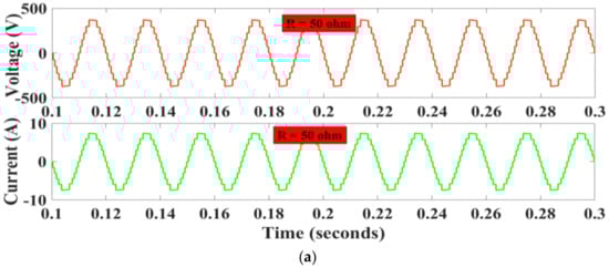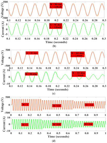 The proposed topology was simulated using MATLAB/Simulink. Figure 5 shows various simulation results obtained for the topology. Output voltage and current waveforms of the proposed 11-level inverter for the purely resistive load (R = 50 Ω) are shown in Figure 5a. Figure 5b shows the voltage and current waveform for RL load (R = 50 Ω, L = 120 mH). The voltage and current plot for dynamic load change from R = 50 Ω to R = 100 Ω and L = 120 mH is shown in Figure 5c. Figure 5d shows the effect of change in modulation values (M = 1.0, 0.8, 0.6). The smooth results showing a sudden change in load and modulation index verify the performance of the proposed inverter. Different parameters taken for the simulation are shown in Table 3.