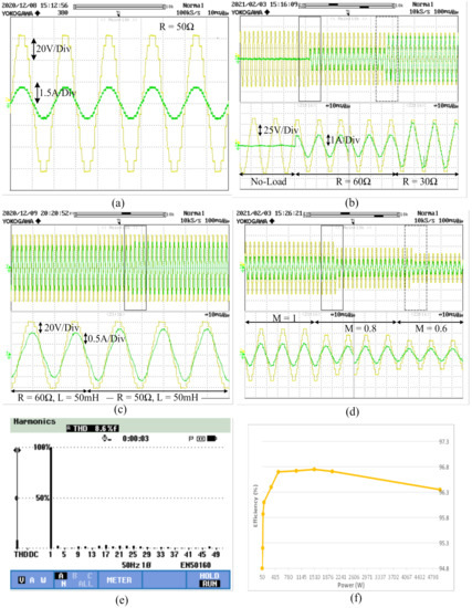 Output voltage and current waveform of the proposed 11-level inverter for (a) resistive load of 50 Ω, (b) dynamic load change from no load to 60 Ω to 30 Ω, (c) dynamic load change from 60 Ω–50 mH to 50 Ω–50 mH, (d) change in modulation from M = 1.0 to M = 0.8 to M = 0.6, (e) THD of the output voltage, and (f) efficiency in different loading conditions.
