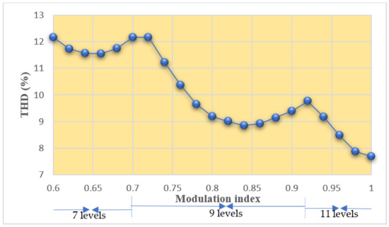 A hardware prototype, shown in Figure 6, was developed to test the viability of the proposed 11-level inverter. An insulated-gate bipolar transistor (IGBT) (FGA25N120) was used to build the circuit. TLP-250H-based gate driver circuit was used for generating gate signals to individual IGBTs. Fundamental switching nearest level control (NLC) scheme was used to produce gate signals. The NLC scheme was implemented with the help of a digital signal processor (TMS320F28379D) for the proposed inverter. A FLUKE 435 series II power quality and energy analyzer was used for measuring experimental THD and efficiency percentages of the proposed MLI. Experimental parameters are shown in Table 4. Figure 7a shows the 11-level output voltage with a peak voltage of around 62 volts and a current peak of 1.2 A for a resistive load of 50 Ω, which validates the voltage gain of 2.5 for an input voltage of 25 V. As the load is suddenly changed from no load to 60 Ω to 30 Ω, the magnitude of load current changes from 0 A to 1 A to 2 A as shown in Figure 7b. Figure 7c represents a dynamic change in the power factor. The load current is steady even after this sudden load change, and the output voltage is also unaffected. The proposed inverter was also tested for different modulation indices that are shown in Figure 7d. It is seen that as the modulation index is changed from 1 to 0.8 to 0.6, the number of output levels is accordingly reduced from 11 to 9 to 7. The output voltage THD is shown in Figure 7e. Output voltage THD was found to be 8.6% when a load of 50 Ω and 100 mH was taken. The efficiency curve of the proposed circuit was obtained by plotting the efficiency at different loads versus the output power using the power quality and energy analyzer, as represented in Figure 7f. The maximum efficiency achieved is 96.75% at an output power of 1500 watts, which decreases as the output power is increased [24,25]. Figure 8 shows the effect of modulation change on the THD of the proposed inverter. Simulation of the inverter was completed at different modulation indices and the THD was obtained. As the modulation index is decreased, THD increases and the number of levels is also affected. Eleven levels are obtained at the output for modulation index of 0.92–1, which decreases to nine for modulation index of 0.72–9 and then to seven for modulation index of 0.6–0.7.
