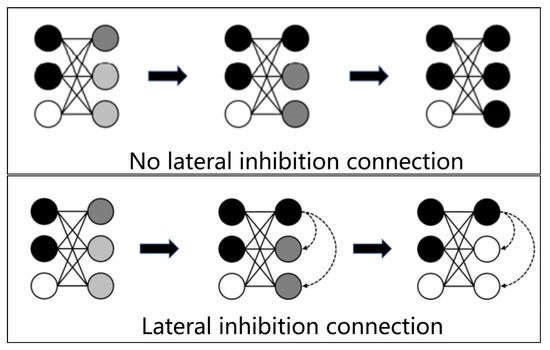 Second is the failure of lateral inhibition due to insufficient computational accuracy and resolution. Lateral inhibition [29,30,31,32,33] can prevent multiple neurons from learning the same feature when the same input pattern may trigger multiple postsynaptic neurons during the learning process, which is a key technique in SNN neuron learning. As shown in Figure 2, lateral inhibitory connection occurs when each neuron in the same layer has synaptic connections in which the connection weight is always negative. When there are no lateral inhibitory connections between postsynaptic neurons and each other, postsynaptic neurons fire sequentially in response to presynaptic neuronal spikes. However, when adding lateral inhibitory connection, the earliest firing neuron will inhibit other neurons in the same layer, reduce their membrane potential, and avoid firing. Clock-driven is effective in most cases [12,34]. However, due to the characteristics of the clock-driven method, if two neurons generate spikes in the same time slice, and there is lateral inhibition between the two neurons, then the specific spike sequence of these two neurons is indistinguishable. Due to the wide application of lateral inhibition, this results in the inability to distinguish the specific spike time sequence is unacceptable. In the clock-driven SNN simulator, the processing method is to reduce the length of the time slice [31]. However, this method reduces the probability of two neurons generating spikes in the same time slice, but cannot fundamentally solve this problem.