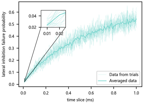 In order to intuitively statistical the possibility of lateral suppression failure, Equation (1) is used to measure, where is the sum of the number of spikes that fired more than once in a time slice, and n is the sum of the number of spikes. If the time slice is 1ms, and the spike firing time of the output neuron is 1 ms, 1 ms, 2 ms, 3 ms, 3 ms, and 4 ms, then it is 2, n is 6, and is 0.33. Figure 3 shows an example, which is the failure probability of lateral inhibition under different time slices in Brian2. It can be seen from the figure that the results of multiple experiments have certain fluctuations, but the overall follow the positive correlation of “the larger the time slice, the greater the probability of failure of lateral inhibition”. Even if the time slice is 0.01ms, there is still a certain probability of lateral inhibition failure for lateral inhibition, which is about 0.022.