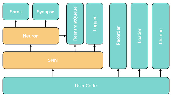 The following is a detailed description of the current popular SNN simulators, as shown in the Table 1. According to the simulation type, SNN simulators can be divided into clock-driven and event-driven. At present, the method adopted by the SNN simulators is mainly clock-driven, which means each calculation update is measured in time slices rather than spike events. In other words, those clock-driven simulators divide the time into time slices by sampling the time and realize the discretization of the time to accomplish the calculation. As the state of the SNN in a time slice is indivisible and atomic, that is, the SNN in a time slice has only one state, the time slice is the minimum resolution of the SNN. Therefore, the length of the time slice will affect the calculation results [16,17,18,19,20,21]. On the other hand, there are some researchers working on event-driven of spiking neural network [22,23]. The earliest event-driven simulator was proposed that can input parameters to simulate the state of the neuron [23]. After then, an event-driven simulation of a recurrent neural network was proposed to verify the effects of synaptic learning on neuron activity by using the event driven models of IF (integrate-and-fire model), LTP (long-term potentiation), and LTD (long-term depression) [22]. However, their designs are not flexible, unable to define neuron models and learning rules, and not suitable for model training and learning. After that, although the event-driven model of neurons, the event-driven model of synaptic plasticity rules, and other strategies have been proposed for event-driven simulators [24], a complete universal event-driven simulator has not been developed.