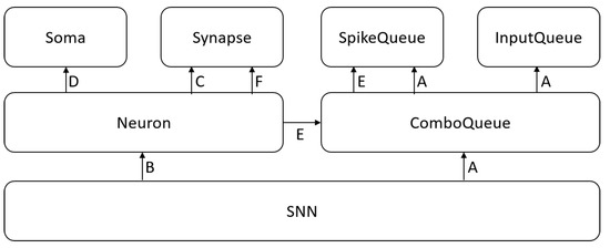 Figure 7 shows the calling relationship of the EDHA core modules (EDHA code is available at http://www.snnhub.com/EDHA/code (access on 12 August 2021)). From top to bottom, the containing relationship between the modules is shown. The upper module is contained in the lower module. The arrows indicate the calling relationship that the caller points to the callee. The letter labels on the arrows correspond to the labels in Figure 6, and multiple identical labels indicate that they are completed in the same step in Figure 6.