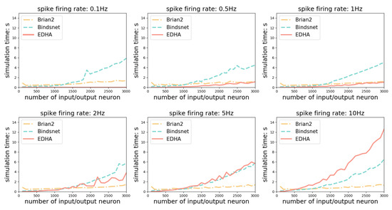 Figure 11 shows the simulation results with fixed connection weight (0, 1) distribution. Each subgraph represents the simulation with the preset spike firing rate of neurons in the input layer. Considering that the wave frequency of human brain under normal activity is about 5–10 Hz, the simulation is conducted at 0.1 Hz, 0.5 Hz, 1 Hz, 2 Hz, 5 Hz, and 10 Hz, respectively. As can be seen from Figure 11, the actual simulation time of clock-driven Brian2 and Bindsnet differs little at different spike firing rate, while the simulation time of event-driven EDHA is closely related to the number of spikes. The curve of Brian2 is always stable, and the simulation time is always less than that of Bindsnet. From the first four subgraphs, at n < 2000 and spike firing rate < 1 Hz, EDHA is the fastest, and even at 2 Hz was comparable to the Bindsnet. In general, EDHA is competitive in the case of small and medium-sized networks and sparse input spikes.