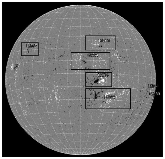 The Helioseismic and Magnetic Imager (HMI) onboard the Solar Dynamics Observatory (SDO) provides the routine full-disk magnetic observation of the Sun. The National Oceanic and Atmospheric Administration (NOAA) provides the location and extension of active regions in the full-disk images day-by-day; one example is shown in Figure 1.
