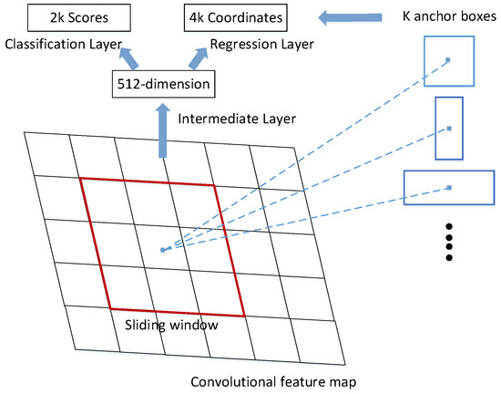RPN aims to obtain a set of rectangular object proposals and their objectness score. As shown in Figure 3, the RPN is mainly composed of a convolutional layer, a classification layer and a regression layer. Each sliding window over the output feature map of the last layer in VGG-16 is mapped into 512-dimensional features, which represents the k anchor box centered at this position in original images. Then, it is fed into a box-regression layer and a box-classification layer, respectively, to obtain the category (positive sample including detection object and negative sample for background) and position coordinate of the corresponding anchor. VGG-16 includes the shareable convolution layers, and the pooling layers. The convolution layers are applied to extract features, and the pooling layers are used to reduce the dimension of the images. VGG-16 includes 13 convolutional layers, each with Relu, and 4 max pooling layers. The pre-trained VGG-16 model is usually used as a feature extractor in the object detection task and can be download in the PyTorch platform [27]. In the preprocessing step, the full-disk images are resized to 1024-by-1024. An image of dimension 1024 × 1024 is reduced to 64 × 64 feature map here. Following the feature extraction network, a RPN is trained to generate object proposals to replace the time-consuming selective search algorithm.