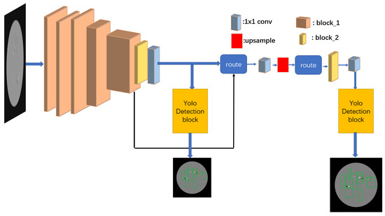 The flow chart of YOLO V3 darknet-19 is shown in Figure 4, where block-1 is composed of conv-batchnorm-LeakyReLU-maxpool modules, and block-2 consists of conv-batchnorm-LeakyReLU modules. The route layer concatenates features from previous layers. In our task, we predict the coordinates of bounding box and classification confidence from the extracted features directly, which means that each bounding box consists of five predictions: , , , and confidence. The extracted features are divided into grid cells. The YOLO detection block can predict five coordinates for each bounding box: , , , and . If the cell has the offset of relative to the top left corner of the image, and the bounding box prior has the width and height of , , then the YOLO block can be predicted by the following: