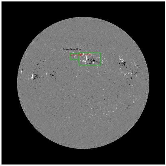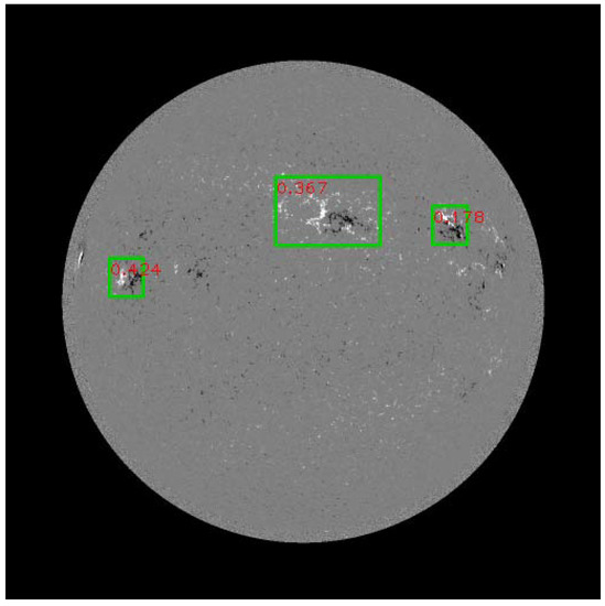 Figure 5 shows an example of faster R-CNN detection of active regions on 4 May 2016. We can find that two active regions are missed, and one quiet region is falsely detected as an active region.