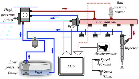 A typical CRD engine’s FIS consists of the major parts—high-pressure pump (HPP), CR system, fuel injector, and the electronic control unit (ECU), as illustrated in Figure 1.