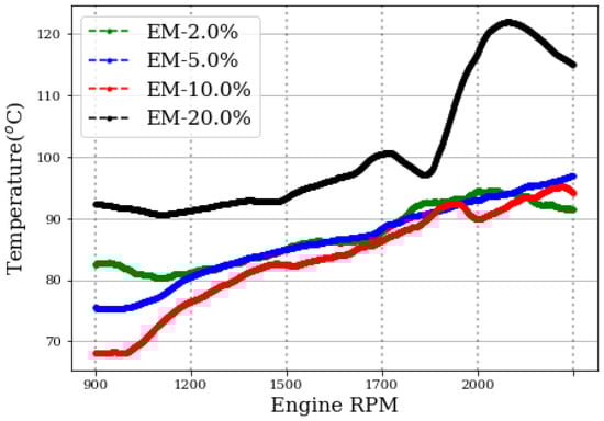 At slower engine speeds (900–1200 RPM) between the green (EM-2.0%), blue (EM-5.0%), and red (EM-10.0%) lines, there is a clear cooling effect (reduction in temperature) resulting from increasing the emulsion compositions. For EM-20.0% (in black), the authors believe that the high W/D composition and the already existing FIS fault caused by EM-10.0% at higher engine speeds possibly induced an increased mechanical stress in the engine. This invariably resulted in overheating in compensation for the poor combustion process emanating from the excess water percentage. Notwithstanding, it is observed from the overall temperature trends that exhaust temperature is increased by increasing engine speeds.