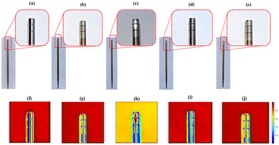 Comparison of injector valve pistons between (a) normal injector; (b–e) worn injectors after experiment, and (f–j) surface profiles for respective injector valve pistons.