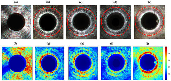 Ideally, the valve piston slides smoothly in the valve in a reciprocating manner during operation while being lubricated by the diesel; however, as shown in Figure 6b–e, the zoomed view of the four injectors valve pistons reveal that they are worn due to friction (highlighted in red rectangles). These are in sharp contrast to a normal (new) piston as shown in Figure 6a. We suspect these wear were induced by the poor lubrication effect of the W/D emulsions used during the experiment. A closer observation of the surfaces in piston valve Figure 6g–j better reveals the wears, as shown by the high frequencies (in red and yellow) compared to that of the lower frequencies (in blue) in Figure 6f. The effects of the W/D emulsions are also observed in Figure 6b–e, which also reveal wear on the injector needles (highlighted in red rectangles) in comparison with that of a normal (new) needle as shown in Figure 6a.