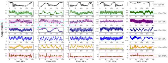 Invariably, the information provided from the FFT and PSD outputs on the respective signals reflect intuitive knowledge on the CR behavior, energy distribution, and underlying spectral characteristics. Figure 9 shows a few samples from the standardized CR signals collected for different W/D emulsions (across the rows in unique colors) at the increasing engine speeds (down the columns)—900, 1200, 1500, 1700, and 2000 RPMs, respectively.