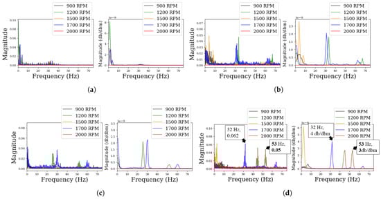 A closer observation of Figure 10d reveals that the lower frequency components are significantly increased when the engine speed is increased to 1500 RPM. Another increase in engine speed to 1700 RPM for the same W/D emulsion condition—EM-2.0% further agitates the 32 Hz component, and when the engine speed is further increased to 2000 RPM, new strong frequency spikes are observed around the 53 Hz in the spectra (in red). This 53 Hz spike further increases in magnitude for the succeeding condition—EM-5.0% as shown in Figure 10e, beyond which it disappears in Figure 10f—EM-10.0%. On the other hand, lower magnitudes of the lower frequency components at lower engine speeds (900–1200 RPM) are revealed alongside higher magnitudes for higher engine speeds (1500–2000 RPM). This hints at a reduced engine combustion rate (poor firing) at lower engine speeds which is intensified (accompanied with cranking sounds) as the engine speed in increased. As a result, we can hypothesize that if the water content in the W/D emulsion exceeds 10%, abnormalities may be experienced in the CR system, which may indicate a fault/failure in the injection system.