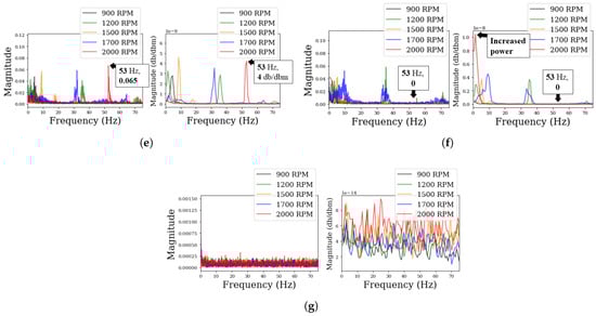 As shown in the figures, the comparison in spectra reveals the underlying CR dynamics of each W/D emulsion composition at different speeds (represented by the overlapping colors in Figure 10a–g). In Figure 10a, across the different conditions and speeds for EM-0%, the signals oscillate predominantly at lower frequencies (0–20 Hz) with several harmonics; however, it is also observed from the different spikes that as engine speed is increased, unique spectral components are observed. More obviously, in comparison between Figure 10b–g and Figure 10a, the impact of diesel emulsification on the CR system is observed from the increased spikes between 20 and 70 Hz. Notwithstanding, within this frequency range, varying engine speeds also generate several distinctive (high-energy) characteristic frequencies in the spectra. Interestingly, our suspicion of engine failure during the use of EM-20% at different engine speeds are validated by the numerous magnitudes in the FFT and PSD spectra, as shown in Figure 10g.