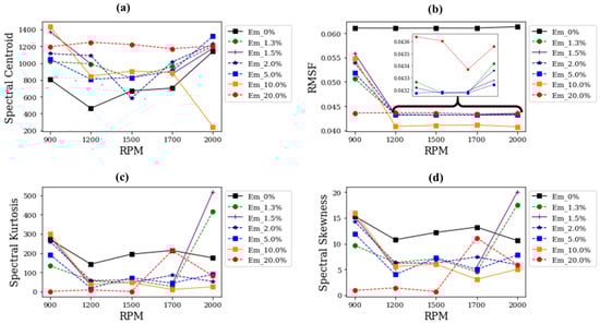 These parameters further reflect the CR dynamics at the different emulsion and speed conditions [27]. Spectral Centroid is a statistical value for the location of the center of mass of the spectrum that allows us to see the information on the frequency and magnitude of the spectral transformation [28], while RMSF reflects the overall energy level across the spectra. Spectral kurtosis reveals how the impulsiveness of the CR pressure signals vary with frequency, while spectral skewness measures the symmetry of the spectrum around its arithmetic mean. Ideally, the skewness return a zero value for a normal distribution and high (positive) values for signals with substantial energy. Figure 11a–d show the comparison using these parameters for different emulsion compositions at increasing engine speeds.