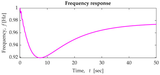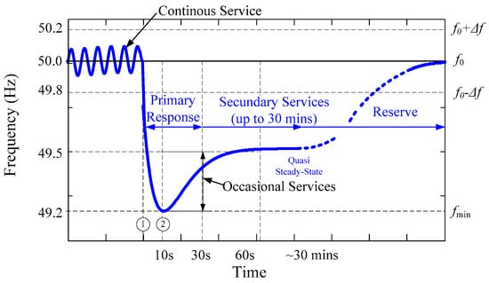 Instantly following an SFD, the system electrical frequency drops (it is shown in the region ①–② of Figure 2) at a rate primarily defined by the total system rotational inertia (summation of the inertia constant of all synchronous generators directly connected to the grid and spinning loads). During the operation of the power system in normal conditions, the system electrical frequency drops further outside of acceptable frequency deviation (Δf = ±0.20 Hz, GB case), and some generating plants are contracted to deliver frequency response. This kind of frequency response is categorised as an occasional service, and the frequency response has two components: primary response and secondary response. Those components are characterised by the additional active power that can be delivered from a generating unit to fulfil the frequency response service, In the very specific case of the GB system, the operational code requires that the additional active power must be available at 10 s and 30 s respectively (primary and secondary response) measured form the insertion of the frequency event and the code also requires that the provision of active power must be sustained for an additional 20 s and 30 min respectively [30].