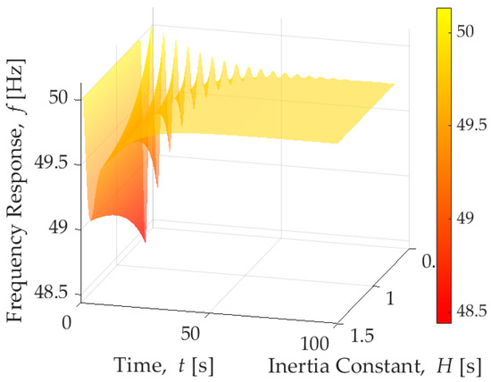 Frequency response (f in Hertz) in a single area power system (shown in Figure 3, considering changes in the inertia H ∈ [0.5, 1.5] s.