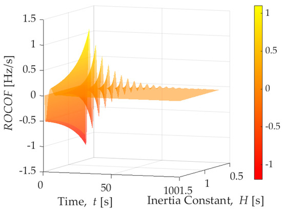 Rate-of-Change-of-Frequency (ROFOF in Hertz/s) in a single area power system, considering changes in the inertia H ∈ [0.5, 1.5] s.