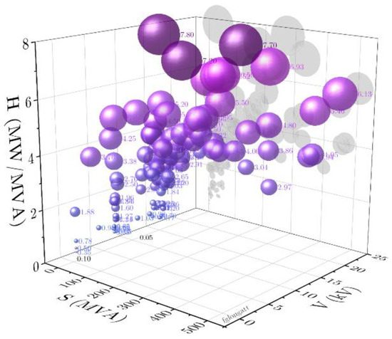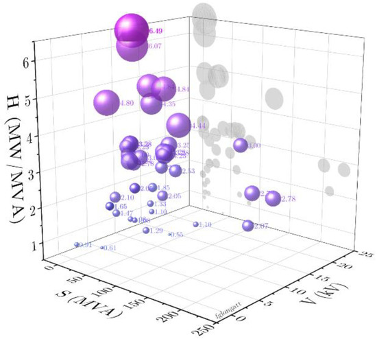 The following illustrates the variations of the rotational inertia between individual synchronous generators installed in a real power system, specifically, Chile and Peru in South America. Using publicly available data, a plot of the individual synchronous generator rotational inertia (H in MW/MVA) versus rated apparent power (Sn, MVA) and rated voltage (Vn, kV) has been created for Chile and Peru, Figure 6 and Figure 7 respectively.