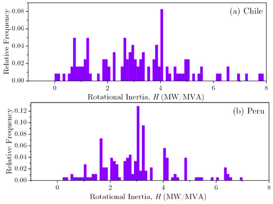 The Chilean power system has 25,000 MW installed capacity with around 26% of that coming from hydropower plants, a histogram of the rotational inertia of individual synchronous generators made clear the variation of its electromechanical property, the rotational inertia varies from 0.0495 MW/MVA to 7.8 MW/MVA (expressed in nameplate rate value) and averaging 3.0797 s. However, most rotational inertia is distributed between 2.0 and 4.0 MW/MVA (see Figure 8a). On the other hand, the Peruvian power system has an installed capacity of 6000 MW, with 86.7% of the demand in the rural areas and thermal power plant generation representing the 52% of the installed capacity and 48% hydropower. The rotational inertia distribution of individual generators in Peru ranges from 0.2183 MW/MVA up to 6.9900 MW/MVA, and an average of 2.9689 MW/MVA. The relative frequency histogram of the rotational inertia shows a central tendency around 2.5 MW/MVA (see Figure 8b). It is essential for the reader to understand that the previous analysis is related to the individual inertia of the installed generators, and it is not the total operating system available during the day a day operation of the system that depends on many other factors (operational and security constraints, etc.).