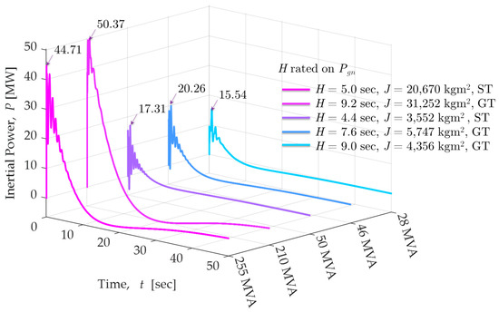 Five different synchronous generators are considered in the assessment, two of them low speed used at steam turbines (ST) and the remaining are typically found at gas turbines (GT); full details are shown in the embedded table in Figure 10. The rotational inertia of those generators ranges from 4.4 s to 9.2 s, considering generation unit sizes from 28 MVA up to 255 MVA. Time-domain simulations are used to obtain the inertial response of each generator to the under frequency event, and time-series of the active power (also called inertial power) are presented in Figure 10. It is clear that the larger the rotational inertia (H), the higher the initial active power immediately after the disturbance (maximum 50.37 MW of 210 MVA, 9.2 s generation unit). Additionally, large rotational inertia implies more energy released during the frequency event.